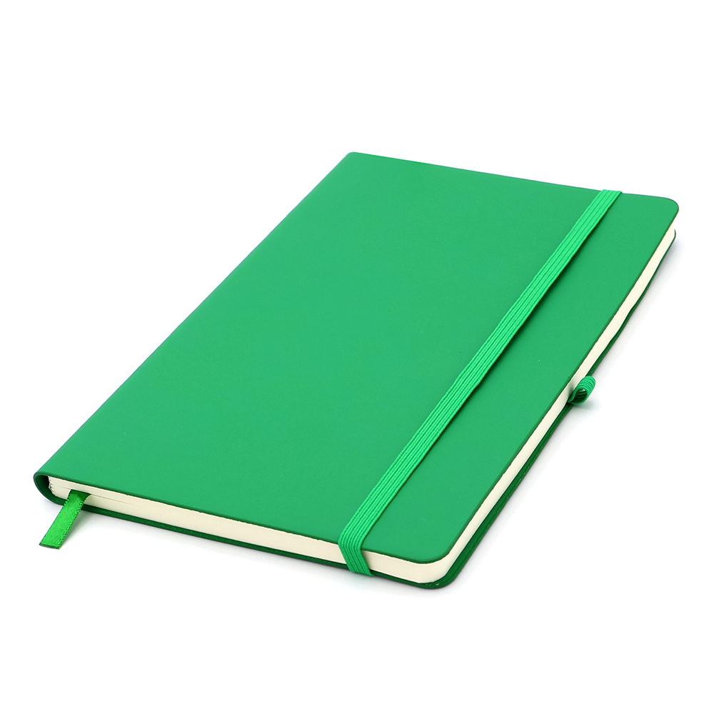 Блокнот формата А5 с мягким покрытием из PU-материала с имитацией рисунка кожи, с эластичной застежкой и текстильной закладкой, наличие петли для ручки в цвет блокнота, 192 страницы, плотность 70г/м, страницы с черными линиями. Цвет по PANTONE® (максимально приближен): 368C.